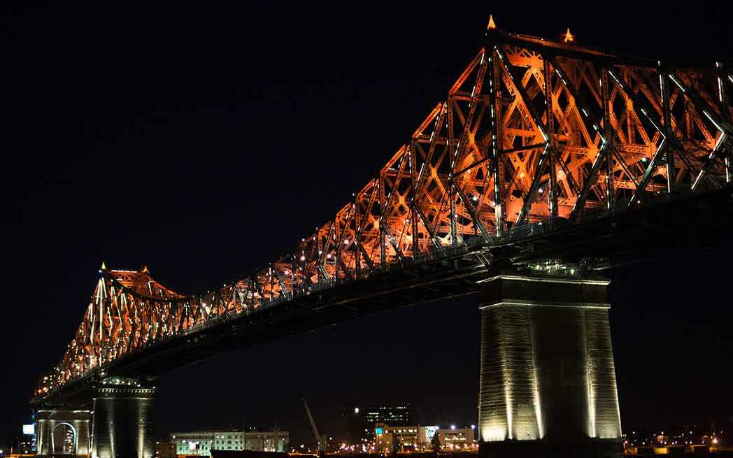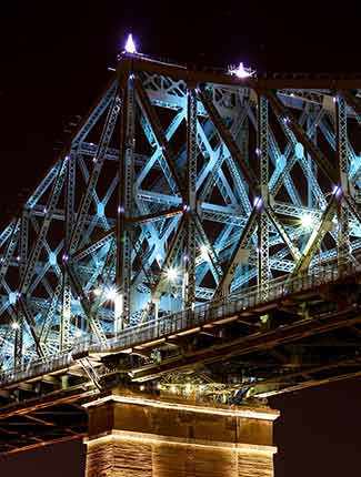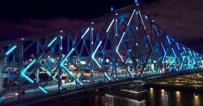 Projet porte-étendard mis en branle pour souligner le 375e anniversaire de la ville et le 150e anniversaire du Canada, l’illumination de ce colosse d’acier a représenté un énorme défi. Cette réalisation qui rassemble la ville et ses citoyens a été possible grâce à une expertise en génie civil et en gestion de projets à grande échelle combinée au talent créatif de Moment Factory et de six autres firmes de design locales de renommée internationale.