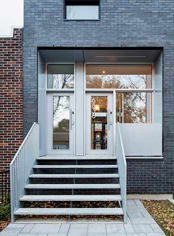 Ce petit bâtiment s’insère de manière respectueuse, mais franchement contemporaine, dans un quartier traditionnel de Montréal.