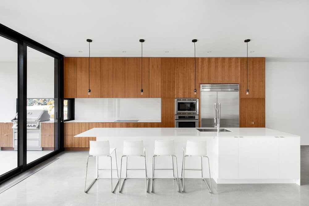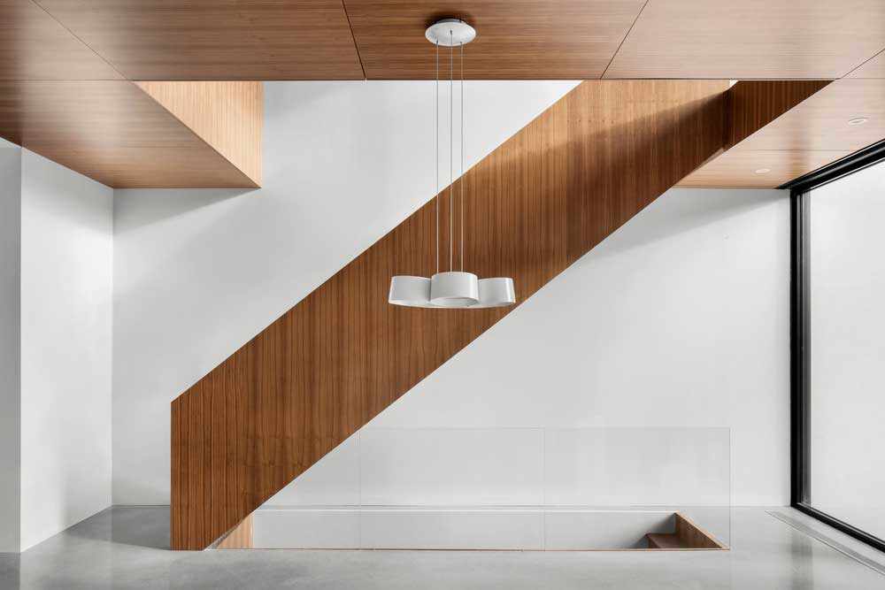 La circulation d’un étage à l’autre se fait par un escalier central, inscrit dans un espace double hauteur; celui-ci est accentué par des garde-corps de verre qui laissent encore mieux pénétrer la lumière du jour. L’aménagement intérieur est minimaliste jouant sur le blanc des murs et plafonds, le béton poli des sols et les chaudes textures des panneaux de bois qui revêtent le long mur cuisine et l’escalier menant aux chambres.