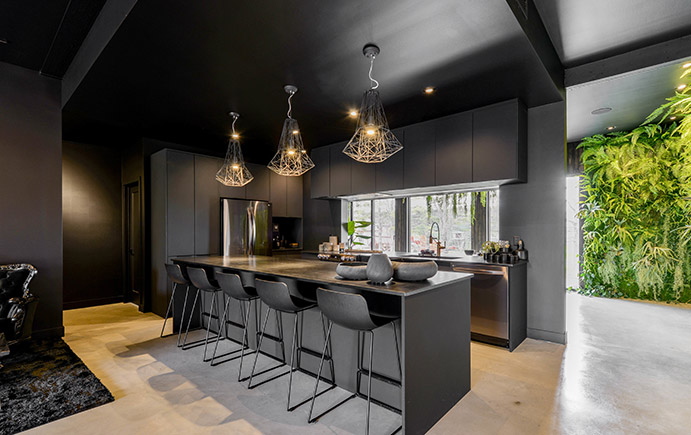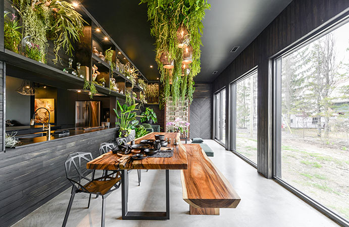 Le design de la salle à manger exploite de nombreux matériaux naturels tels qu’une table de bois massive ainsi qu’un mur tapissé de plantes montantes, forgeant une atmosphère surréelle. La cuisine adjacente adopte un style épuré et monochrome où le noir est omniprésent.