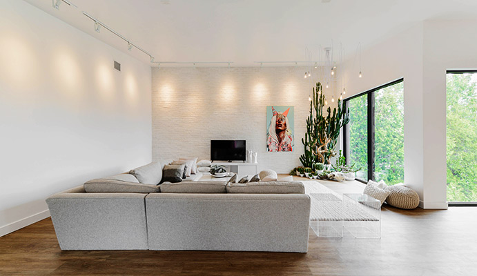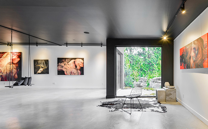 La résidence de l’artiste Rio, située à Saint-Sulpice, consent à la vision du peintre aspirant de joindre aires de vie et galerie d’art privée. Reconnu pour son approche éclectique et adepte de design, l’artisan gardait le désir de concevoir une esthétique cadrant son univers intrinsèque et ainsi surprendre ses visiteurs.
