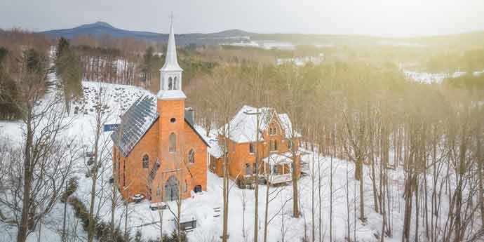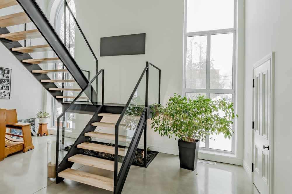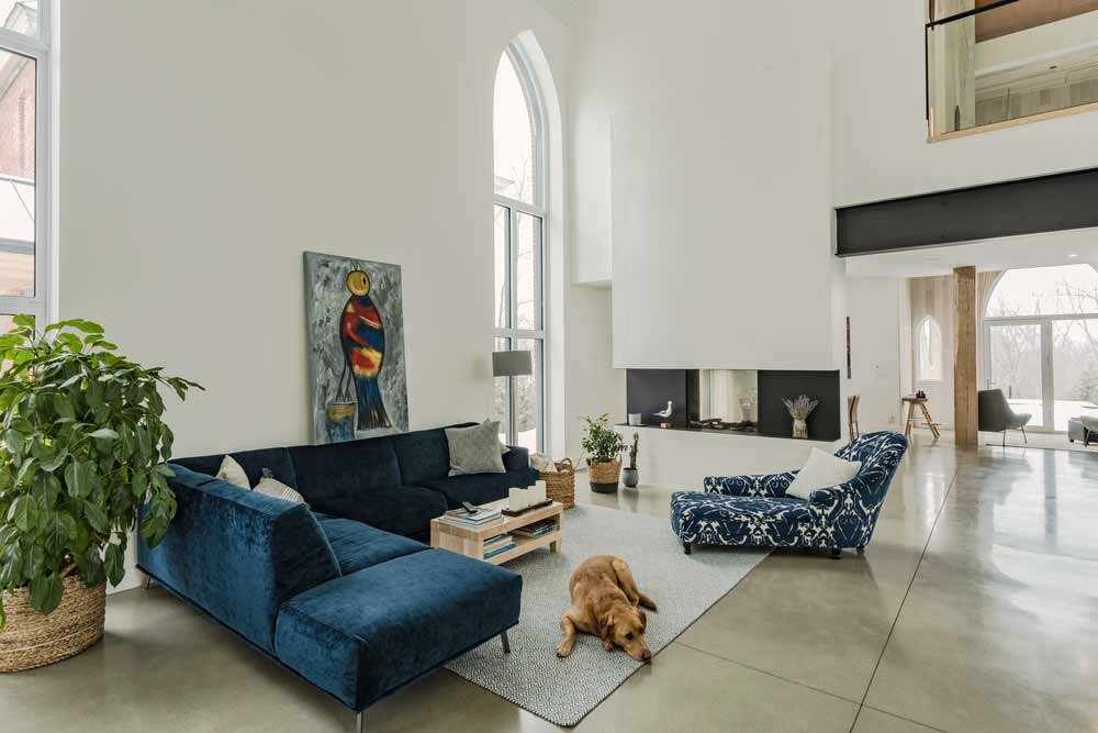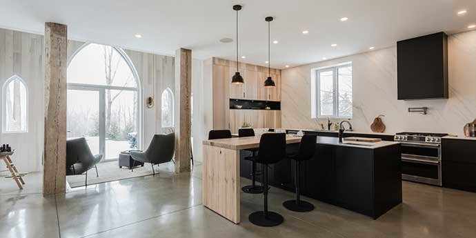 Along the shores of Pike River in the Montérégie, this neo-Gothic residence has kept its original character while integrating contemporary design. The house as a whole remains an emblem of local heritage.