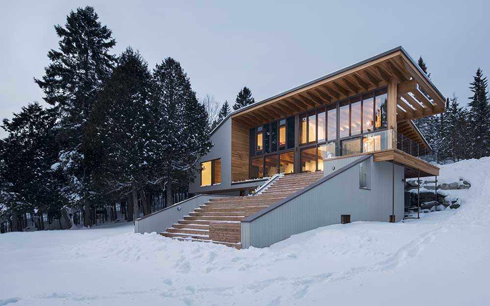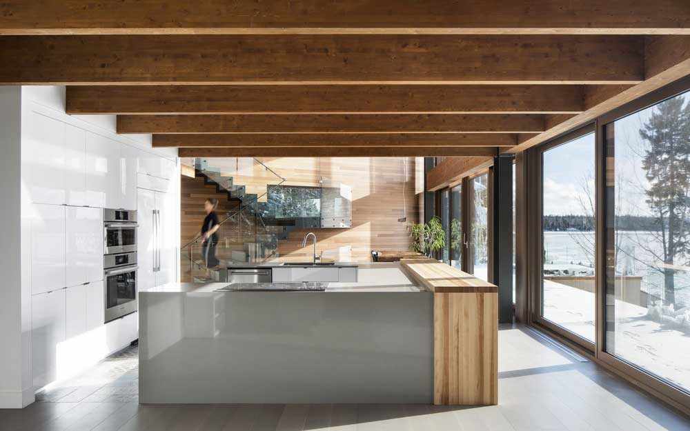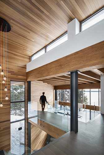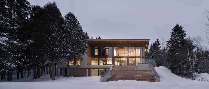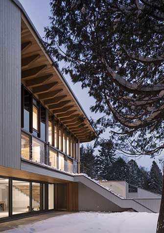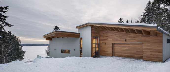 Cette résidence contemporaine se démarque par l’expression de la structure de bois. Les poutres apparentes à l’intérieur se poursuivent vers l’extérieur accentuant l’effet de transparence vers le lac. La toiture s’avance ainsi pour limiter les surchauffes solaires d’été de la façade vitrée au sud.