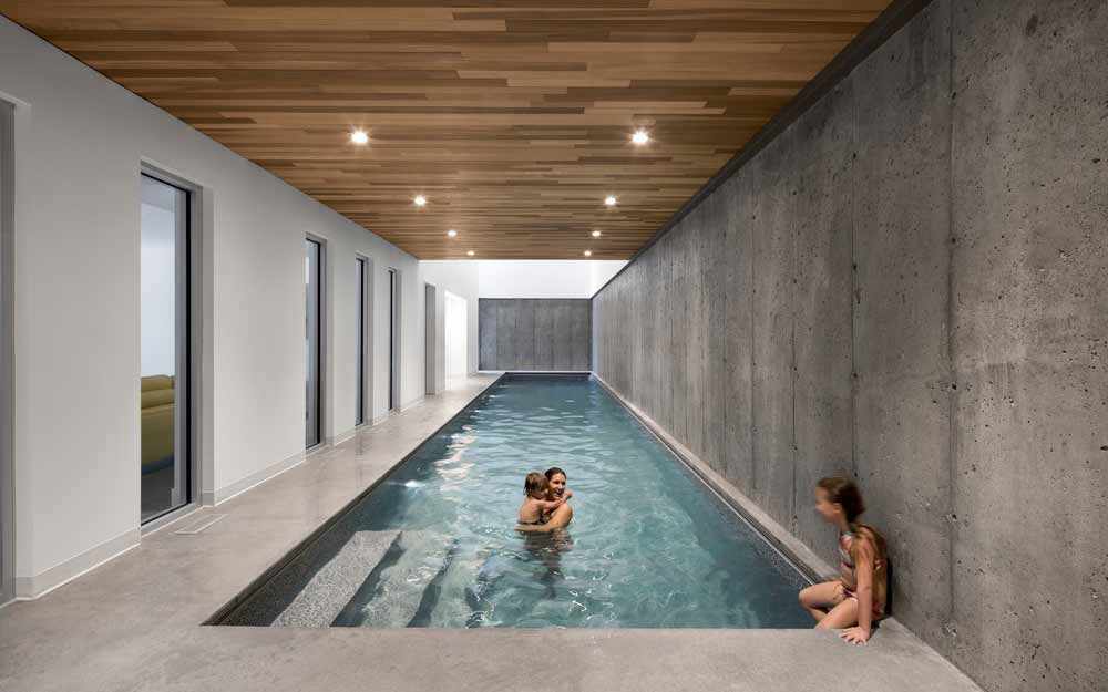 L’escalier reliant les trois niveaux est léger et dynamique : il longe la paroi de cèdre rouge et mène au rez-de-jardin. C’est à ce niveau que l’on découvre une piscine intérieure, un secret bien gardé, insérée au cœur de la résidence. On y accède en traversant la mosaïque paléolithique qui orne les murs de la douche. La lumière naturelle balaie le mur à l’extrémité de la longue piscine et invite à la nage.
