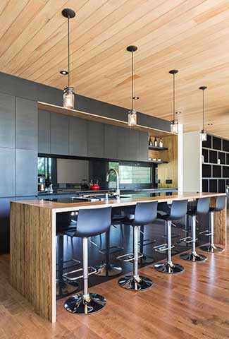 Au niveau du rez-de-chaussée, les espaces sont dégagés et s’ouvrent sur une vue imprenable du lac. Les pièces en enfilade, baignées de lumière, se terminent par une véranda qui prolonge la cuisine vers l’extérieur. Ce grand volume du rez-de-chaussée s’étire perpendiculairement à la crête de manière à maximiser le panorama sur plus de 60 pieds de long. La couleur noir du frêne de la cuisine et du mobilier intégré vient contraster avec la blancheur des murs et brise la monochromie. Par ailleurs, la percée visuelle du foyer à double face situé au centre de la pièce commune accentue la sensation chaleureuse qui se dégage des lieux. Le plancher, revêtu de bois naturel tout comme la terrasse, permet un passage de l’intérieur vers l’extérieur tout en subtilité. Ce volume des aires de vie en cèdre naturel forme le cœur du projet et réunit la famille. Il marque la transition entre l’activité des espaces inférieurs consacrés aux enfants et le calme de la suite parentale à l’étage.