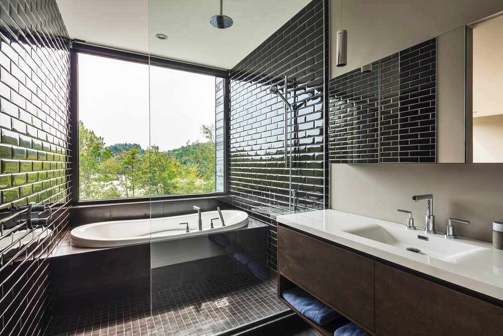 Tout en haut, une seconde masse en cèdre noir surplombe dramatiquement l’entrée et domine les environs. Elle abrite les appartements des maîtres, soit une chambre, une salle de bain complète et un large walk-in.