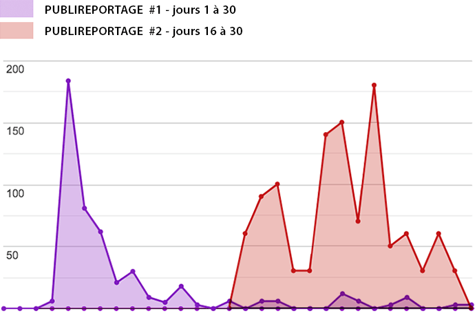 Voici un exemple de résultats analytiques pour 2 campagnes combinées, décalées de 2 semaines • Période de promotion: 30 jours