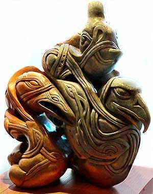 Transformations chamaniques, rêves, passage du temps, voyages en mer, autant de thèmes que ce maître-sculpteur interprète dans ses œuvres, autrefois des blocs de pierre informes… Parmi les thèmes qu’explore brillamment l’artiste au travers de ses œuvres, on retrouve Sedna – la déesse mère de la mer et des animaux marins dans la mythologie inuite – et le chamanisme, mais également Odin, Thor et Beowulf ainsi que des motifs graphiques résolument vikings, dont un bestiaire qui inclut des ours polaires et des oiseaux de proie, ainsi que des dragons et des chiens.