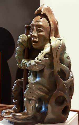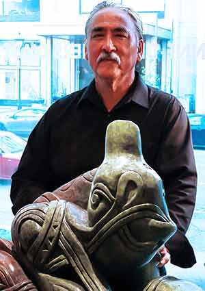 Né en 1951 dans les Territoires du Nord-Ouest, son premier vernissage avait lieu en 1971 à Toronto mais ce n’est toutefois qu’en 2016 que Ruben recevait l’Ordre du Canada. De par sa maitrise du médium, sa technique et ses thématiques, cet artiste est exceptionnel. La quinzaine d’œuvres qui nous sont présentées lors de cette exposition sont soit des bronzes, soit de la stéatite (pierre à savon) du brésil teintée d’ocre ou striée de brun foncé. Ses autres matériaux de prédilection sont les vertèbres et les côtes de baleine, la stéatite de l’Oregon et de la Colombie britannique.