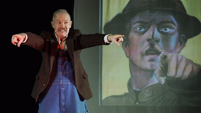 Nawrocki: My lockdown solo play, Eviction? Dog’s Blood!! Nick Zynchuk & Montreal’s Red Plateau, 1933 (2020), was about the life of a Polish/Ukrainian unemployed worker who was gunned down by the police in Montreal on St-Dominique Street during a housing eviction protest. His funeral drew 30,000 people, the largest Montreal had ever seen. Ukrainians, Pelicans & the Secret of Patterson Lake (2020) was about my family’s emigration to Manitoba in 1900 from Ukraine and the racism and hardships they endured at the hands of English/Scottish settlers. Women Strike! The Winnipeg General Strike 1919 –2019 (2019), was about the lives of nine immigrant working-class women during the historic strike. I wrote a series of four ‘sex comedy’ cabarets in the 1990s about date rape, sexual harassment and violence against women, but didn’t joke about the serious stuff. Over a million people saw my live performances in Canada and the U.S. (I Don’t Understand Women!, My Dick & Other Manly Tales, Sex Toys!, and Lessons from a 7ft Penis).