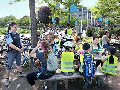 Part One of the course, lasting an hour and a half, introduced children to the Quebec Highway Safety Code. SPVM officers explained the rules, and gave safety tips, as well as examples of different situations cyclists, may encounter. Cycle Néron was on hand to inspect the children’s bicycles, ensuring they were road-ready. New this year were representatives of the Contactivity Social Action Committee, who spoke to the students about care when cycling around seniors who often have reduced hearing, vision, balance and reaction time.