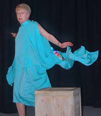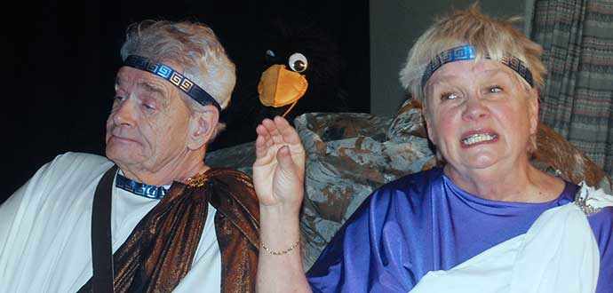 Here, nine talented but non-professional actors undertook 23 roles, not even counting the recurring chorus. Two Athenians, Makenmeda (Clive Brewer) and Goodhope (Jenny Chopra), fed up with life in crowded, bureaucratic and Hippocratic Athens, wander to the distant mountains to join the free flying birds among the clouds.