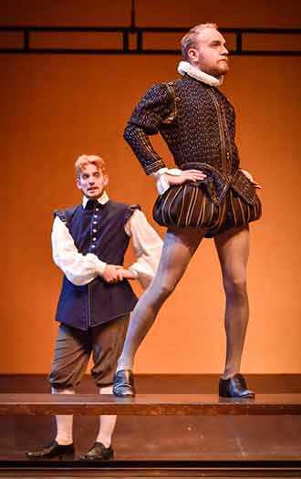 The scene was set in Naples, where boisterous English cavaliers come at carnival time for rest and relaxation, i.e. drinking, fighting and whoring. Belvile (Gabriel Richardson), one of the group, is desired by Spanish heiress Florinda (Rosalie Trembley Johnston) but since her father is away, she and her sister Hellena (Shauna Thompson) are governed by their brother Don Pedro (Christopher Mejaki). He plans to marry off Florinda to his buddy Don Antonio (Jake Wilkinson) and send Hellena to a nunnery.