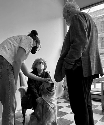 A volunteer provides pet therapy to seniors at home – Image: The Yellow Door staff photo