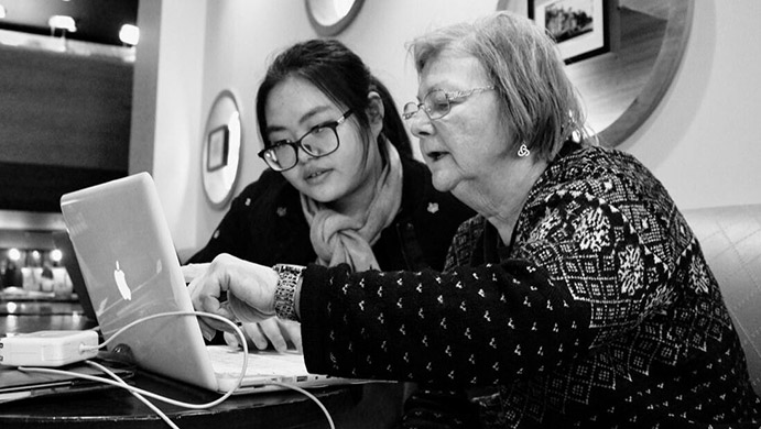 A volunteer gives tech support to a senior – Image: K. Slomski