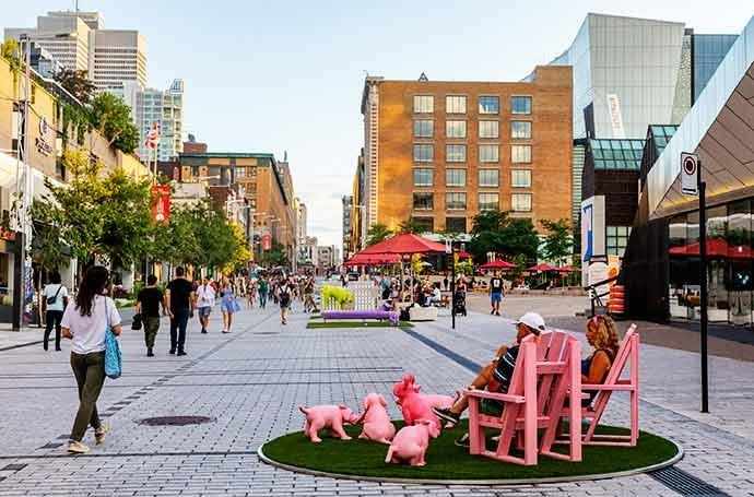 La relance économique et culturelle vient en appui aux commerçants et aux artistes et remet de la vie au centre-ville dans un périmètre établi entre les rues Atwater et Papineau ainsi qu’entre la rue Sherbrooke et le fleuve Saint-Laurent. Évolutive et progressive, l’animation du centre-ville se fait par différents projets de piétonnisation, d’aménagement de l’espace public ainsi que des prestations spontanées et une offre culturelle bonifiée. Ces initiatives sont une invitation au public à participer à la relance de Montréal, tout en vivant une expérience sécuritaire selon les normes de la santé publique.