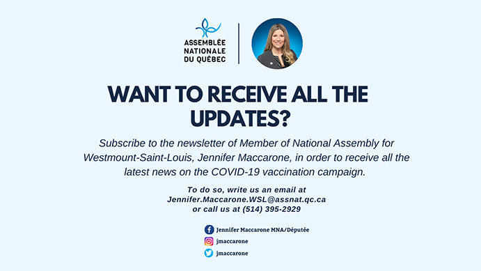 If you would like to receive updates on the COVID-19 vaccination campaign, subscribe to the newsletter of Member of National Assembly for Westmount-Saint-Louis, Jennifer Maccarone, by sending an email with your contact information to Jennifer.Maccarone.WSL@assnat.qc.ca or by calling (514) 395-2929.