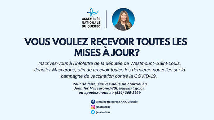 Si vous désirez recevoir toutes les mises à jour concernant la campagne de vaccination contre la COVID-19, inscrivez-vous à l’infolettre de la députée de Westmount–Saint-Louis, Jennifer Maccarone, en envoyant un courriel avec vos coordonnées au Jennifer.Maccarone.WSL@assnat.qc.ca ou en appelant au (514) 395-2929.