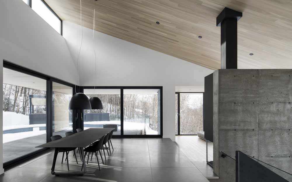 La toiture en pente s’intègre harmonieusement à l’environnement bâti. La géométrie du volume et le placement des ouvertures créent des ambiances surprenantes en lien avec les fonctions intérieures. Le puits de lumière de la salle à manger offre une vue élégante sur la cime des arbres, tout en inondant de lumière indirecte les lattes de cèdre. Le mur central en béton confère une verticalité au projet, avec un traitement brut qui révèle les marques du coffrage. L’escalier adjacent s’enrichit de la dualité des matériaux authentiques qui l’entourent, mêlant béton et acier.