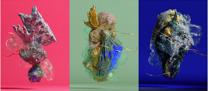 « Nous avons travaillé à partir de modèles 3D de sculptures, mis en ligne gratuitement par de grands musées, pour les briser, les déconstruire et en rassembler des morceaux choisis. De là sont apparus des objets organiques et protéiformes que nous avons habillés de textures vivantes et vibrantes. Ces objets uniques reflètent les infinies possibilités créatrices que permet le web par la mise en commun de connaissances et les partages culturels. J’aime penser que ces objets sont comme des organes qui assemblent différents moments de l’Humanité, des éléments d’un corps nouveau, réinventé. Une forme d’hommage à nos propres corps tant affectés ces deux dernières années. »