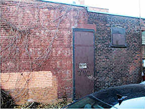 Boarded-up door and windows, covered with bricks, on the side of the former 1920s Falle’s grocery market.