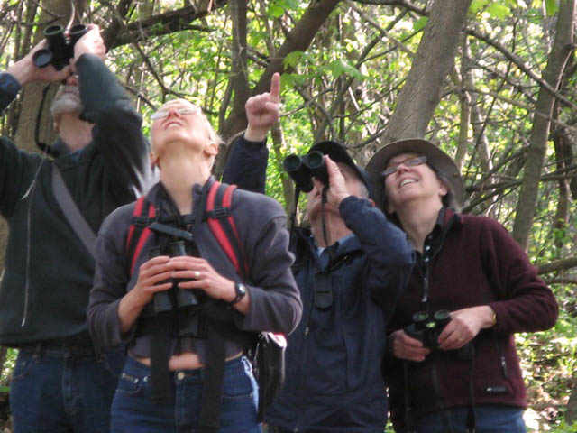 Let’s assume it’s a brilliant May morning and you’ve just arrived for your first warbler outing. The early birders already gathered at the Lookout’s parapet wall are dressed in casual outdoor wear with handy pockets for notes and pens. They enjoy recounting the rare birds seen on their latest outings with BPQ. You’ll notice the high-powered binoculars they carry. If you’re just starting out, you might consider Nikon Travelite Ex binoculars that are moderately priced, have a bright image and a handy belt carrying case.