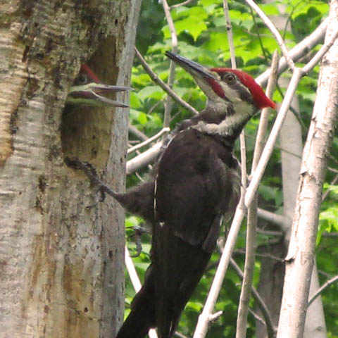 Suddenly the woods resound with the jungle roll of a Pileated Woodpecker hacking away at an old tree trunk. It is a huge bird with a red cap not unlike the famous cartoon woodpecker. A shy bird formerly unused to urban life, it is now a woods regular.