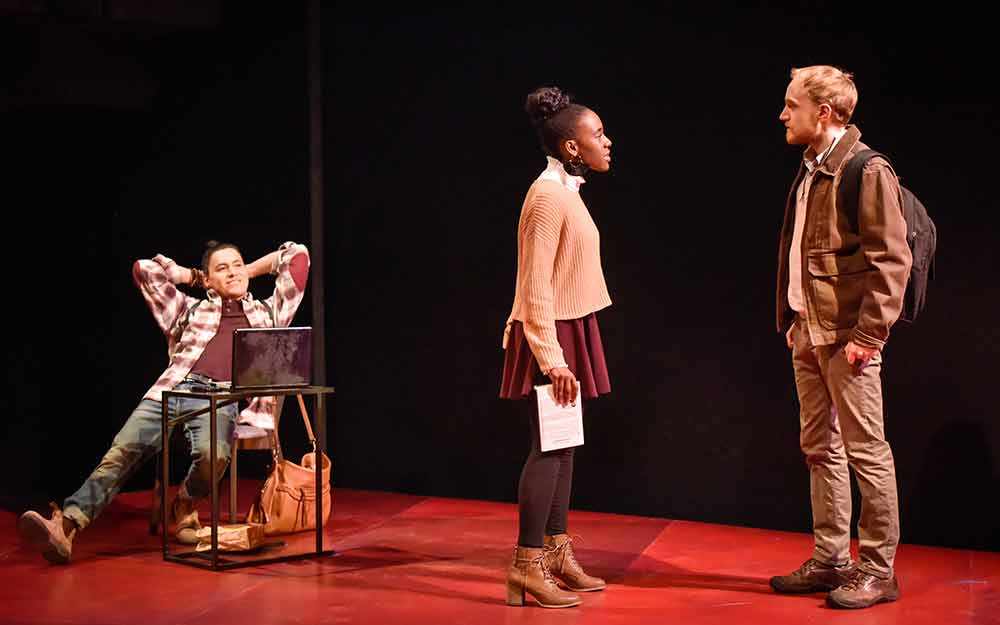 I do not recall any mention of their parents, who do not appear on stage. Anyway, they share an apartment together. Both the sister, Alyssa (Charlotte Dennis), and one brother, Kevin (Robert Gerow), are employed at a university, but the other brother, Johnny (Kenzie Delo), has been rejected as a student and is unemployed. Johnny voices increasing White Power sentiments while Kevin, with more liberal beliefs, fumes.